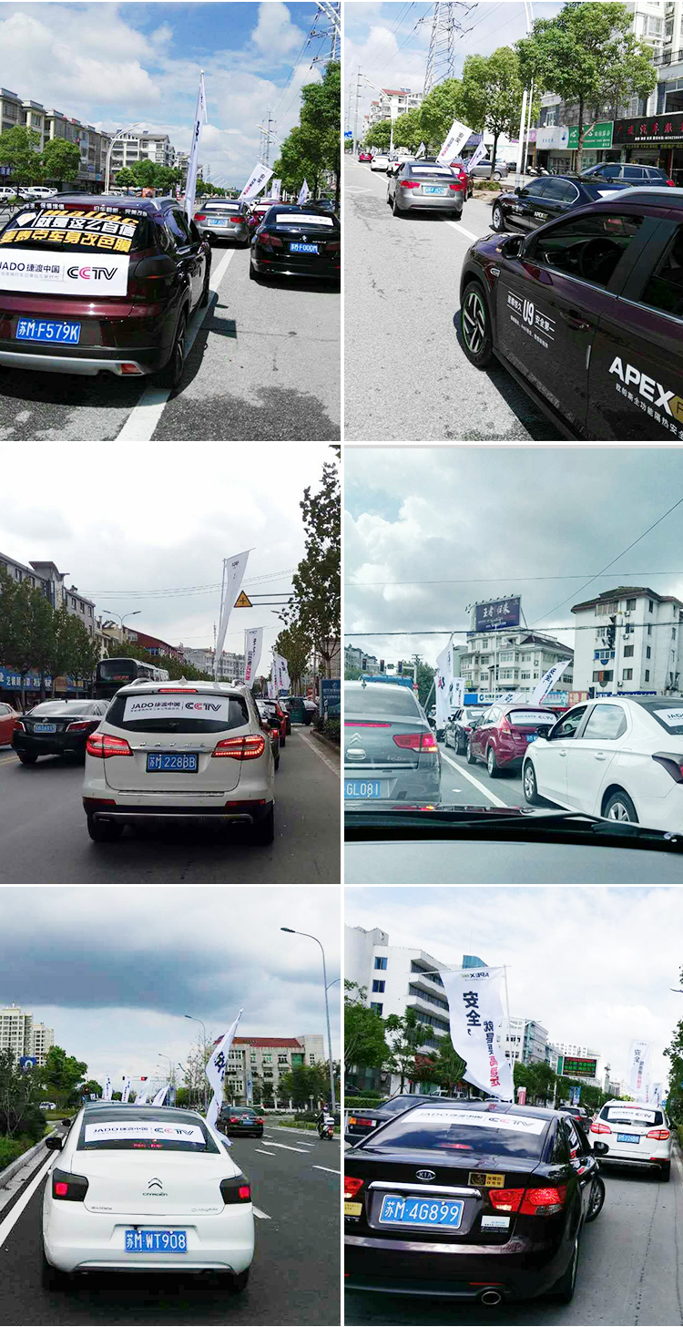 活動開始前,在揚州天泓汽車貿(mào)易有限公司所有工作人員的密切配合下,近110輛私家車的后擋風(fēng)玻璃貼上了“JADO捷渡中國|CCTV”鮮明字樣的單透,并與車主達(dá)成共識:文明駕乘,注意行車安全。