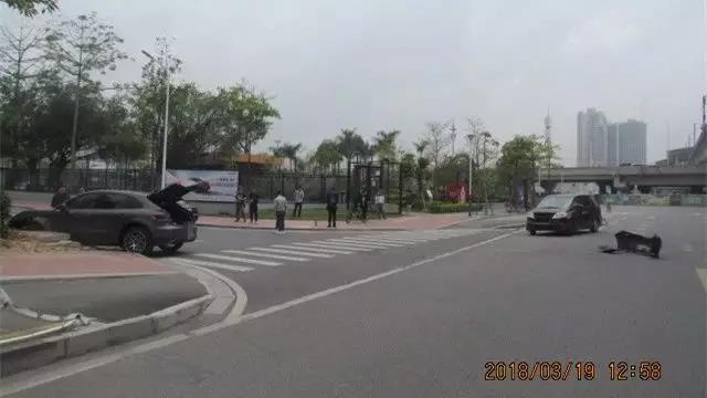 2018年3月19日,在廣東珠海,一輛保時(shí)捷車行駛在港昌路最右側(cè)車道上,被左側(cè)的一輛本田車突然地向右變道給撞到左側(cè)車身,然后失控朝著右前方的路基沖去,撞到水泥底座才停下。