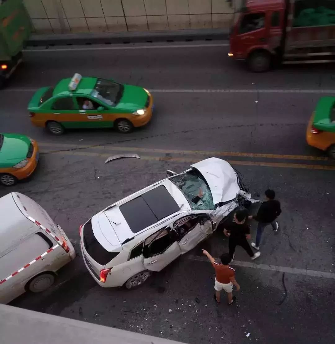 事故發(fā)生的地點在玉祥門盤道下穿隧道入口處,當時是一輛白色凱迪拉克SUV轎車高速行駛與對向面包車發(fā)生碰撞。根據市民提供的行車記錄儀視頻顯示,凱迪拉克在從右側實線變道至左側超車時,因高速行駛躲避路面障礙物不及,造成車輛方向失控,越過雙黃線撞向對面駛來的一輛面包車,整起事故發(fā)生過程前后只有5秒鐘。