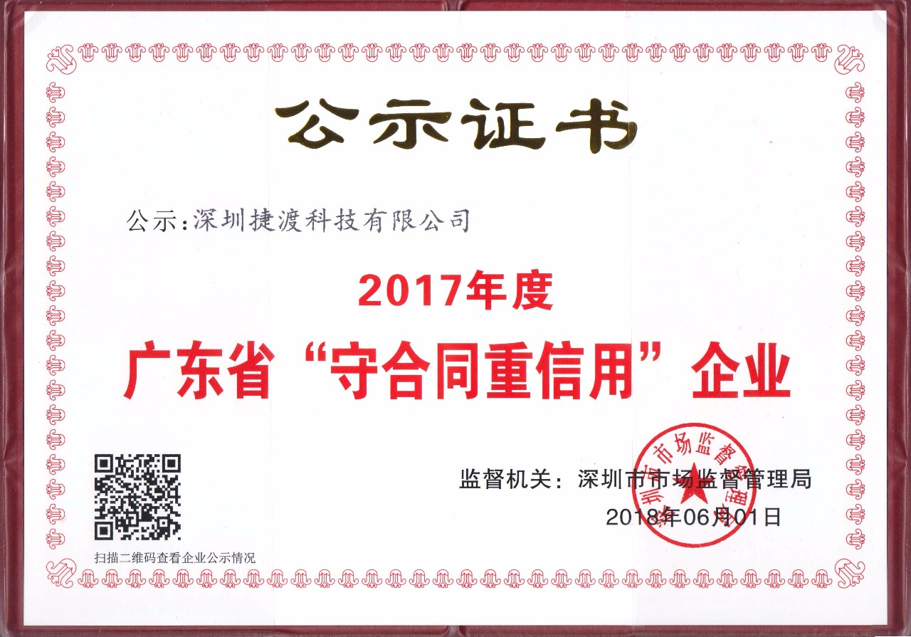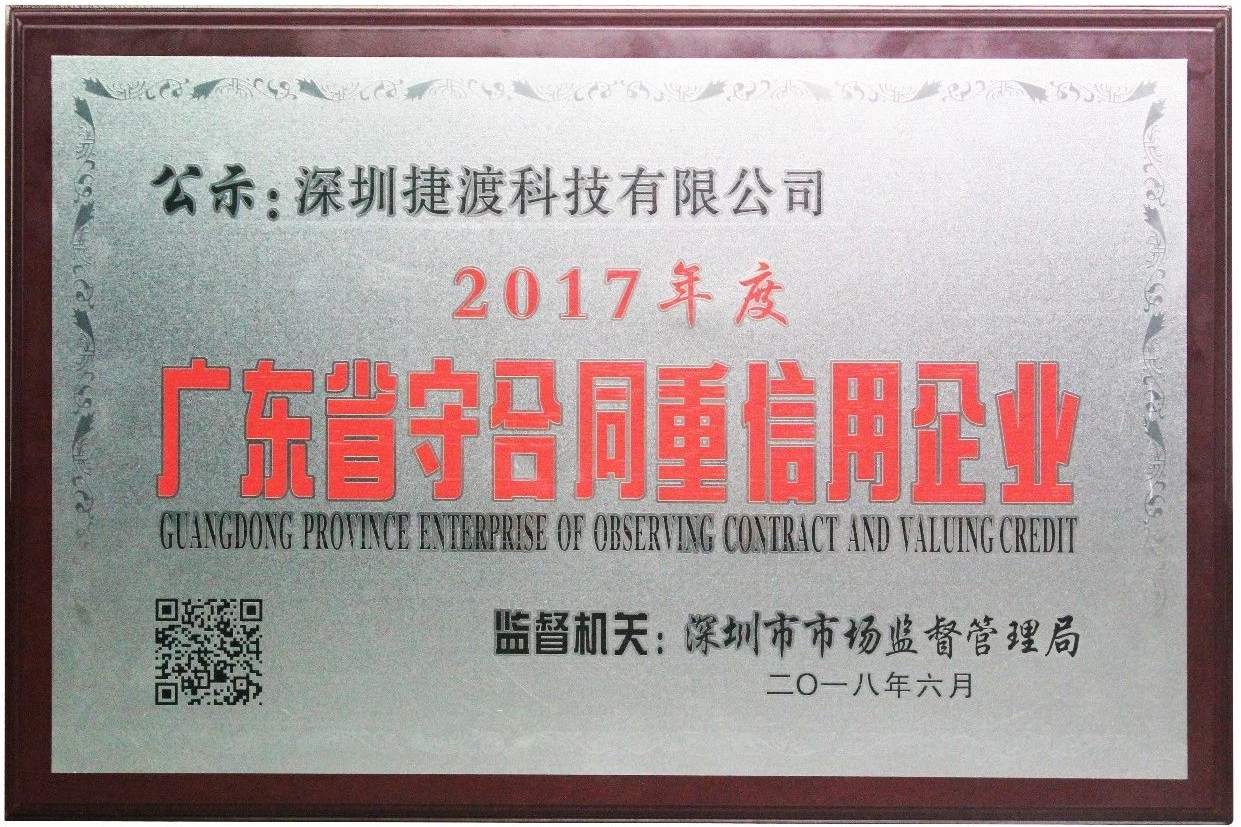 6月13日上午,2017年度廣東省“守合同重信用企業(yè)”的授牌儀式在深舉行。JADO捷渡智能(中國)獲頒 “守合同重信用企業(yè)”榮譽證書,這是社會各界和廣大企業(yè)對公司一貫嚴守合同信用、堅守商業(yè)誠信的高度評價和充分認可。