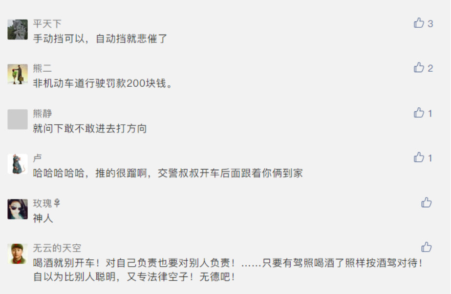 小酒怡情大飲傷身,在路面上推車,有一定的交通安全隱患,后方行駛的車輛對這些人會產(chǎn)生安全威脅。小編提醒,為避免酒后駕車,還是應該將車放置到安全地點,或者找熟人代駕,一定要為自己的安全著想!