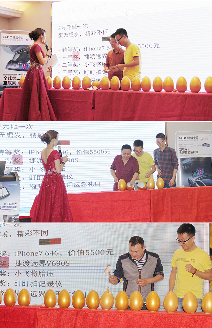 會(huì)上,主辦方盛東方為大家準(zhǔn)備了精彩爆場(chǎng)的砸金蛋活動(dòng),并由客戶按照下單順序依次砸蛋,其中特等獎(jiǎng)為iPhone7,一共5個(gè),iPhone7雖未上市,但是盛東方彭總有言在先,只要砸中特等獎(jiǎng)的客戶絕對(duì)是iPhone7發(fā)售之后的第一批用戶。同時(shí),還有遠(yuǎn)界系列V690S、小飛將胎壓、盯盯拍、捷渡遠(yuǎn)界車用大禮包等產(chǎn)品等大家砸蛋開獎(jiǎng)。