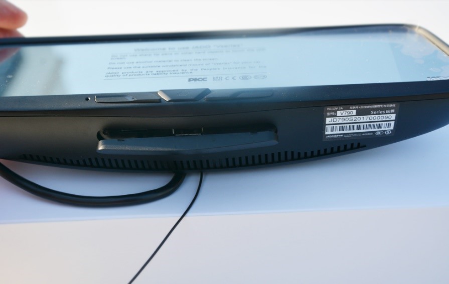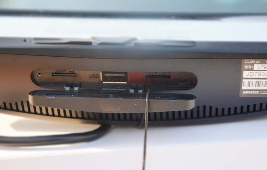 底部分布的有散熱孔,同時(shí)個(gè)DVR卡槽,USB接口,TF卡槽,GPS卡槽也位于底部。其中TF卡槽插入儲(chǔ)存卡,就能是使用行車(chē)記錄儀后保存數(shù)據(jù)。